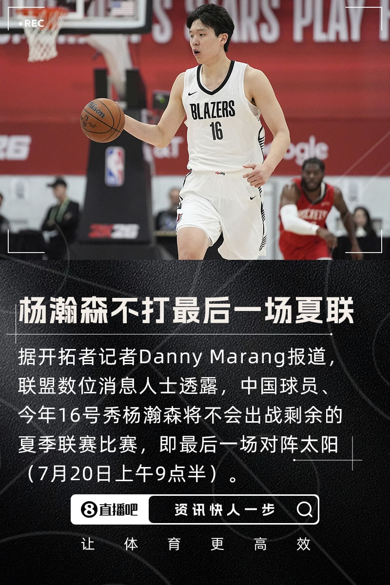 07月19日讯 据开拓者记者Danny Marang报道,联盟数位消息人士透露,中国球员、今年16号秀杨瀚森将不会出战剩余的夏季联赛比赛,即最后一场对阵太阳(7月20日上午9点半)。